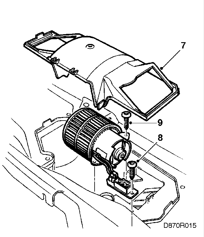 Remove blower motor cover. Remove screw securing blower motor resistor connector. Remove blower motor mounting screws, and lift out blower motor and fan unit.