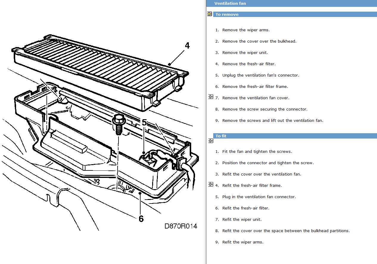 Remove wiper arms. Remove cover over bulkhead. Remove wiper unit. Remove fresh-air filter. Unplug blower motor connector. Remove fresh-air filter frame. Remove blower motor cover. Remove screw securing blower motor connector. Unplug and remove blower motor resistor. To install, reverse removal procedure. Ensure electrical wires are not pinched.