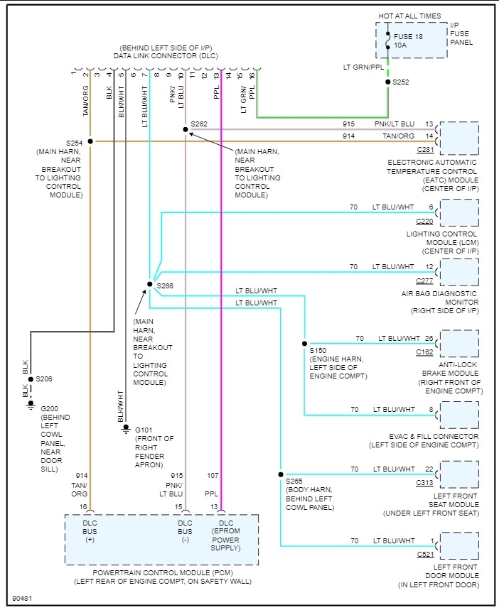 If you check resistance on the circuit between the data link connector, tan wire with orange stripe, and the EATC module connector, pink wire with light blue stripe, there should be less than 5 ohms of resistance.