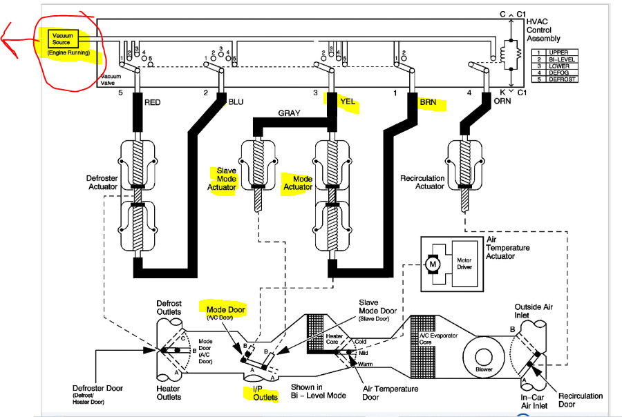 Pic 2 shows the entire system. I highlighted the mode actuators. Note the Plastic vacuum hoses to them are known to dry out and break. Also, the arrow in the upper left of the picture shows the vacuum supply is from the engine. We may have a leak under the hood as well.