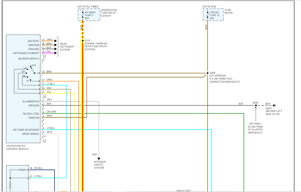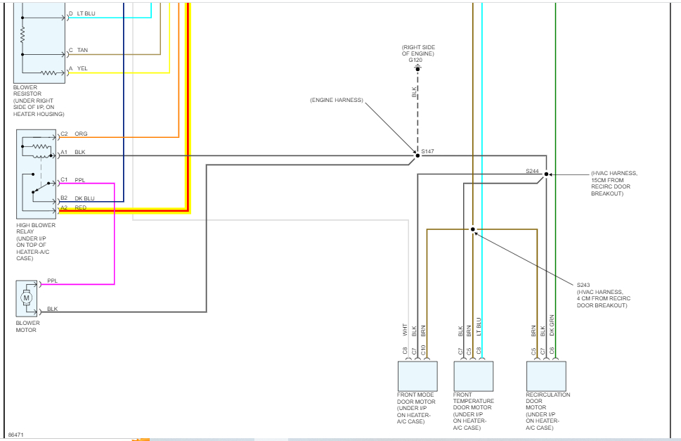 Blower motor blows 50-amp maxi fuse when put on high speed even with the blower motor disconnected. Replaced relay and blower resistor and checked the blower motor with jumper to battery.