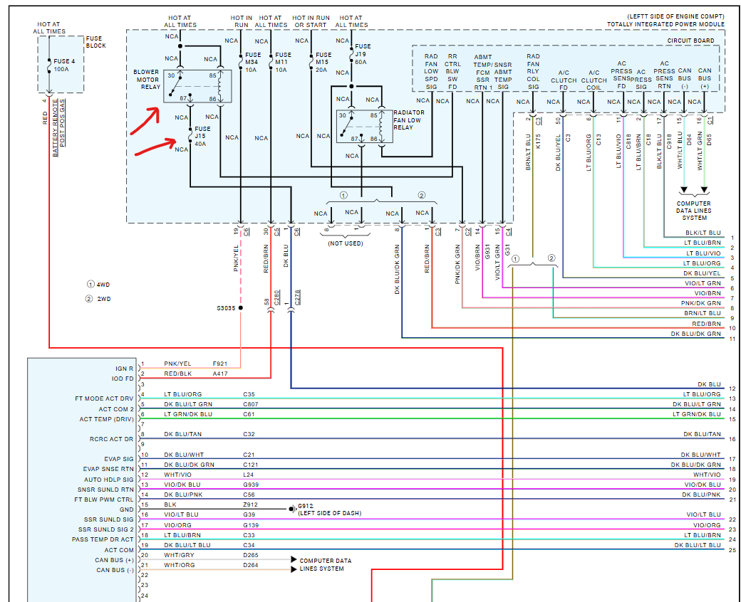 Blower motor does not work at any setting. The vehicle is equipped with dual temperature auto climate control. All other features seem to be working. I replaced the Blower motor power module, but I am still not getting any voltage at blower motor terminals in any fan speed position. (Tested with multimeter probes to 2 motor connector terminals). I have tested M11 and M34 fuses are good. What's my next step?