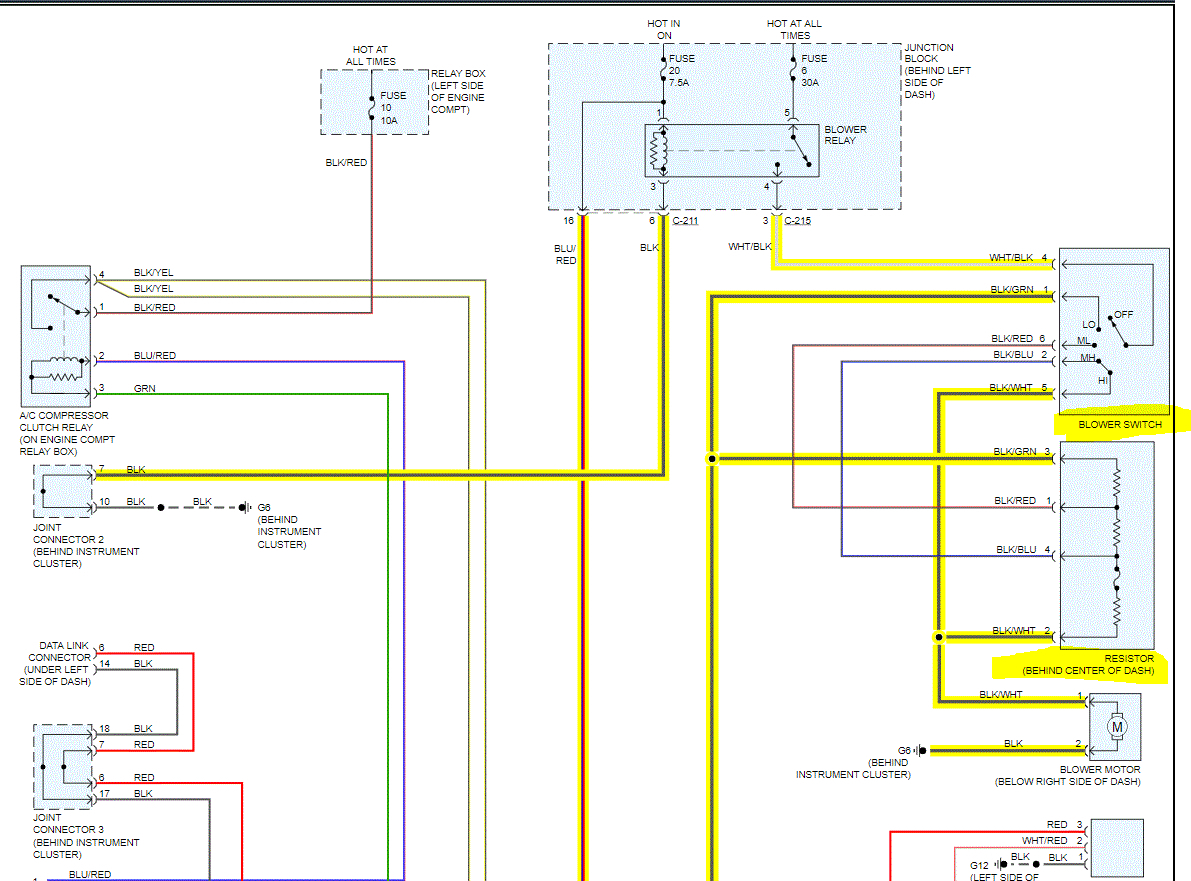 I attached the entire wiring schematic below for the HVAC system. I highlighted a lot of wires related to the blower motor for your reference.