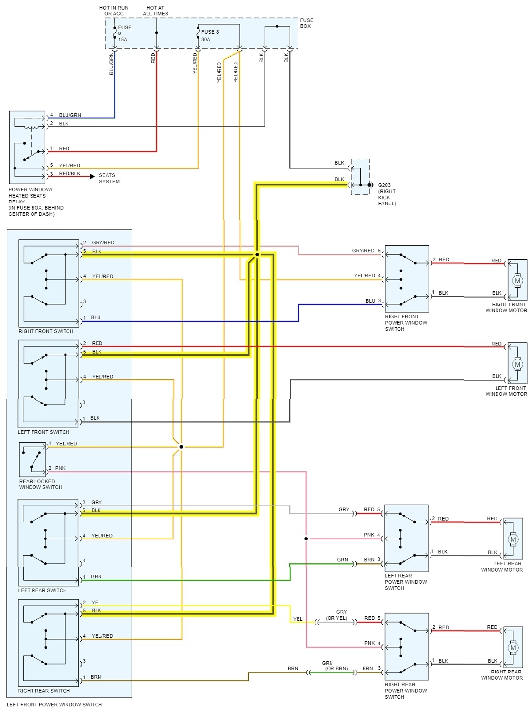 Since I went through the work of formatting some pertinent diagrams, I'm including them, again, if they will help. The fifth diagram is for the cooling fan circuit. The sixth one is for the power windows. In these two circuits, fuse # 9 isn't involved in the high-current side of the systems, so there's a good chance this is not the place to look for something shorted.