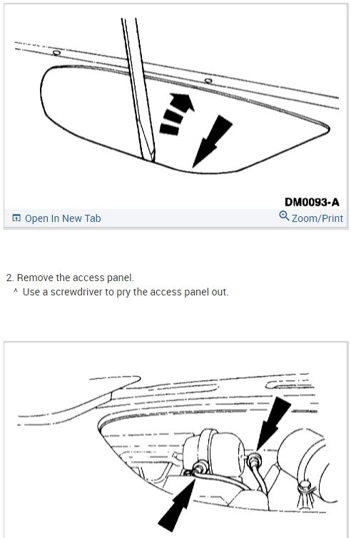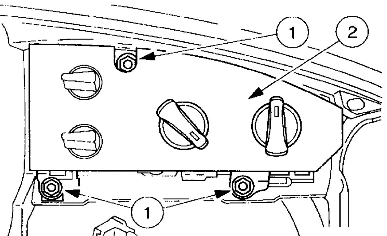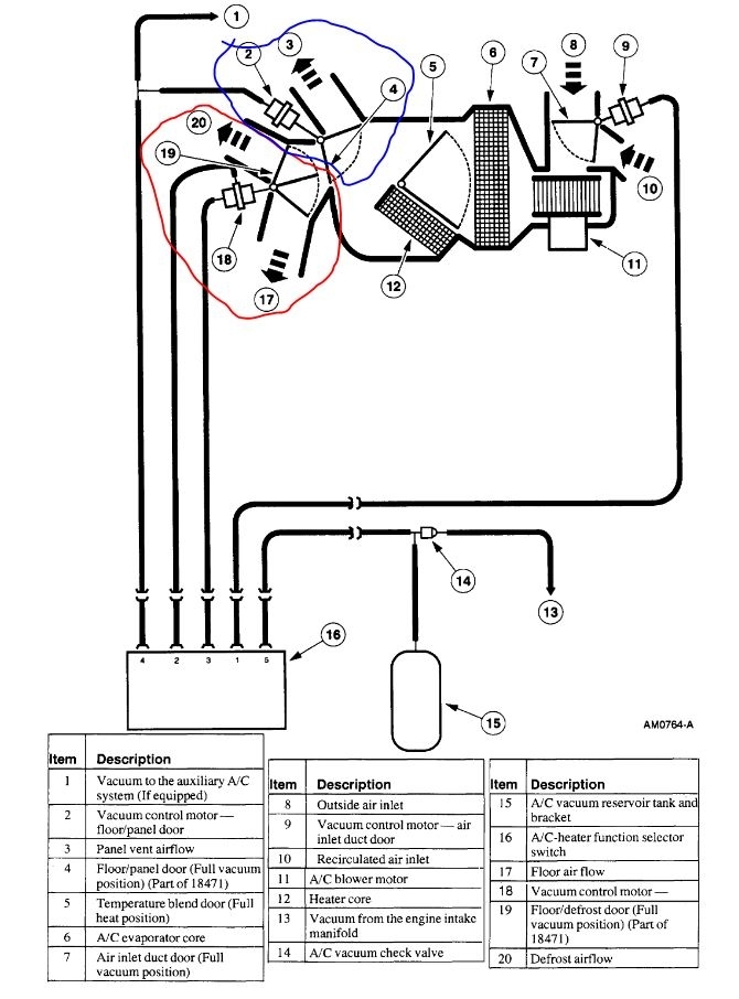 So the air only blows through the defrost duct? It will not switch to dash or floor correct? If that is the case then it's likely a vacuum problem. The floor/defrost door is controlled by one vacuum motor while the dash vents are a different one and it's not common for both to fail at the same time. To test this you can remove the access panel to get to the door motors. With the panel off, start the engine and select floor and defrost on the control panel while you watch the vacuum motors and see if they move. If they don't then remove the vacuum lines and listen and feel for vacuum as you select defrost and floor. If you hear and feel nothing try to select recirculate or outside air, does that control operate? If not those are all vacuum controlled from the dash control. However I would start by checking the vacuum lines from the manifold to the vacuum reserve canister and it's check valve. Ford made this very difficult as the vacuum reservoir is now part of the HVAC case and not easily replaceable, However it could be replaced by adding an external vacuum canister if needed. In the third image you can see the vacuum lines. If you move the controls but see no motion look on the intake manifold of the engine and find the line that runs back to the firewall and check it for cracks or damage. If it looks okay the next step will be to check at the heater control itself for vacuum. For that you need to remove the center trim panel from the dash. With it off you can remove the screws that secure the heater control to the dash. Pull it out and on the rear you will find the vacuum harness connection in the 5th image. Remove that and start the engine. One of the lines (port 5) should have vacuum on it with the engine running. If you have a good vacuum there put a vacuum gauge on that line and then shut off the engine, does it hold a vacuum for a few minutes? If yes then the control head is the likely problem, the seals and rotor in them can fail. If you don't feel or hear the vacuum you will need to trace the line over to the HVAC case. If you find no breaks in the line you likely have a bad line or vacuum reservoir that is leaking. What I would do in that case is replace the factory unit with one from a different vehicle, like a Dorman 47077 and a check valve like the Motorcraft YG193 and use those parts to repair the system without the need to remove the HVAC case to get to the original one. You would run the vacuum line from the engine to the check valve inlet, then a hose from one of the outlets to the vacuum canister and a hose from the other outlet to the coupler that goes to the dash control unit. That would replicate the OE vacuum system but in an accessible location.