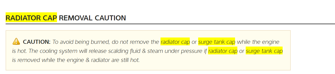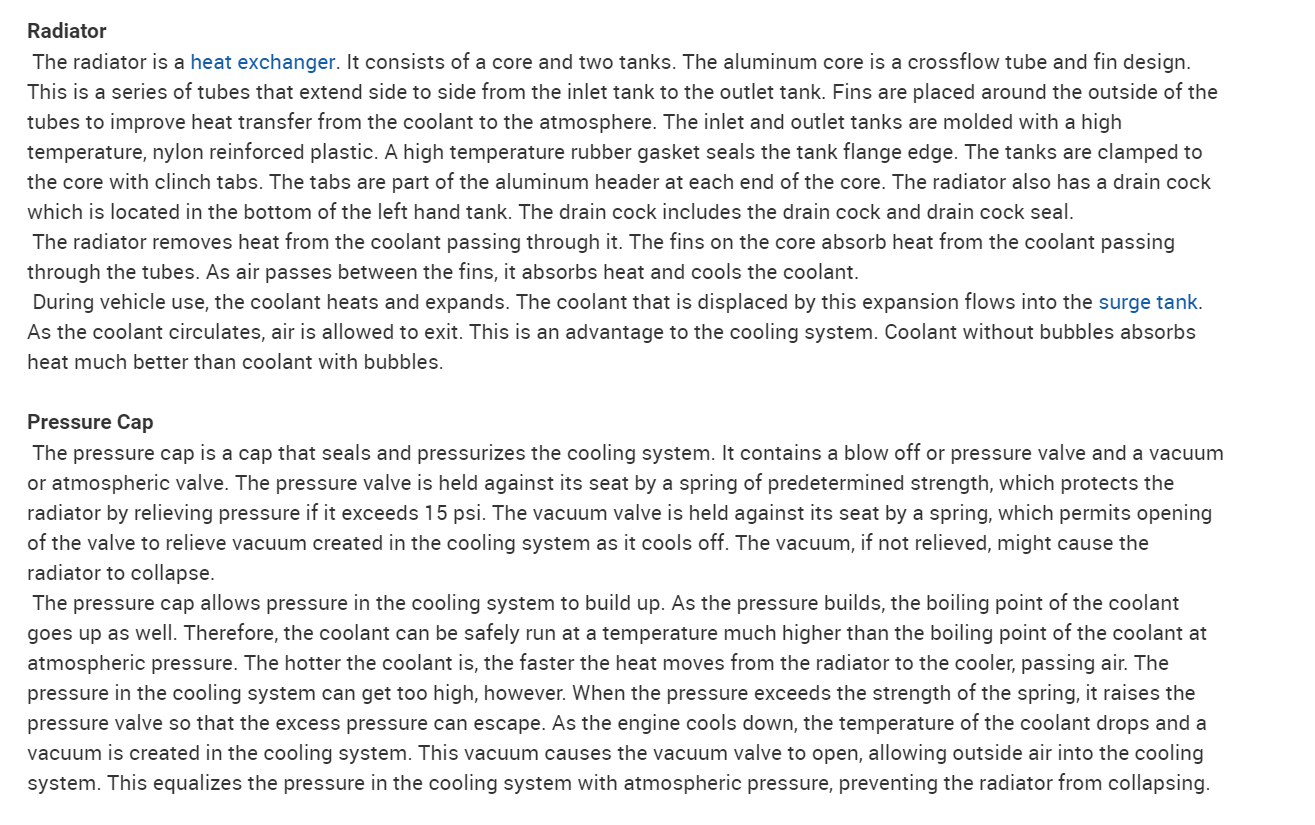 In the diagrams down below I have included a description of exactly how your vehicle's cooling system works, as well as an exploded diagram of it and precautions for removing the radiator pressure cap. I have also included a link for you to go to below for testing your head gasket.