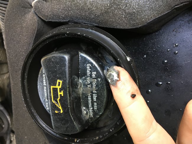 There was also water, oil and a greyish gunk around the filler cap on the engine.