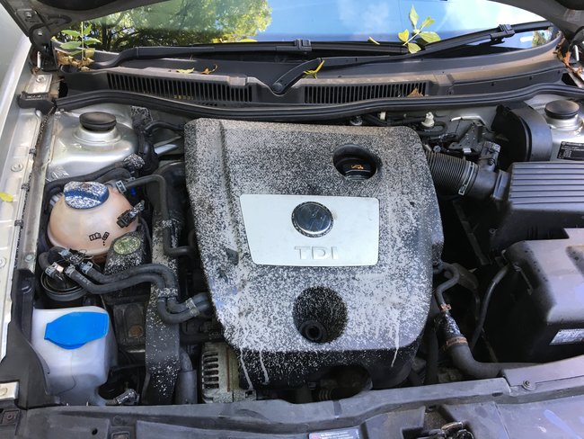 When I looked under the bonnet the engine cover and other plastic parts were covered in a spray of a grey/brown substance. This has stained the plastic and will not come off. When I rub the substance it becomes shiny almost like graphite from a pencil.