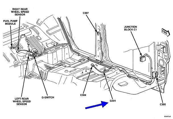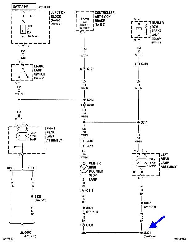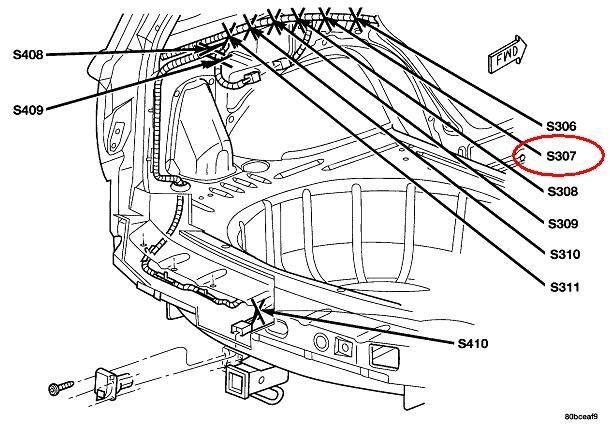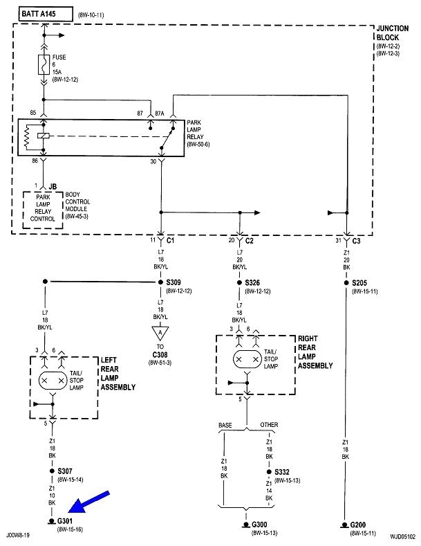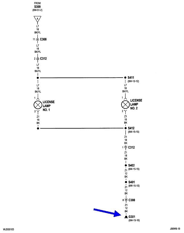 The additional clue is to observe which other lights don't work. From the diagrams, you'll see ground # G301 is shared by the left brake light, back-up light, tail light, and both license lamps. If all of those lights don't work properly, the best suspect is ground # G301, under the driver's seat. All those circuits come together at splice # S307. If some of those lights work, ground # G301 has to be okay, then the problem lies between splice # S307 and the inoperative light socket.