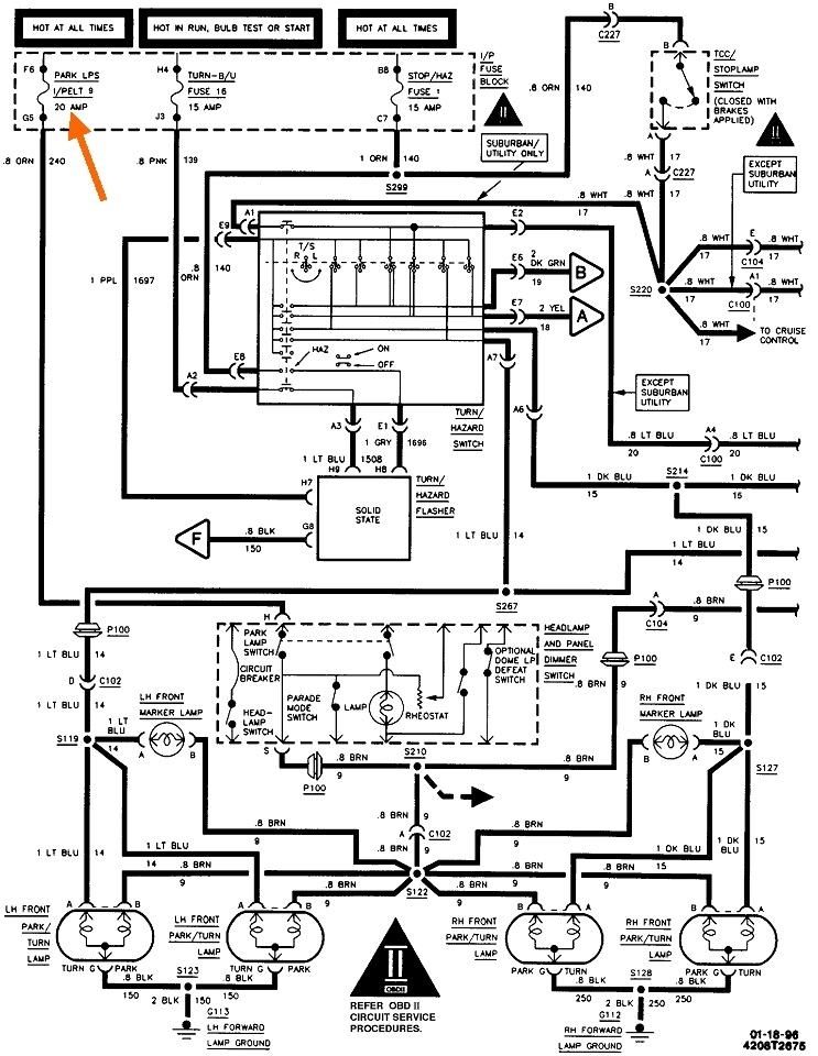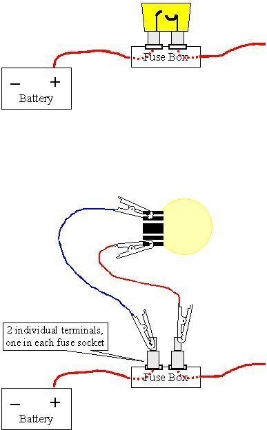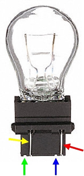 Now we have to know which fuse you have the bulb in place of. Earlier you were in the 30-amp maxi-fuse for the brake lights. The rear signals and the rear brake lights are the same bulb and filament. When the turn signals are released, current from the brake light switch passes through the signal switch on its way to the rear brake lights. One side has a short, so the fuse blows, or, in this case, the test bulb is full brightness when you press the brake pedal.
