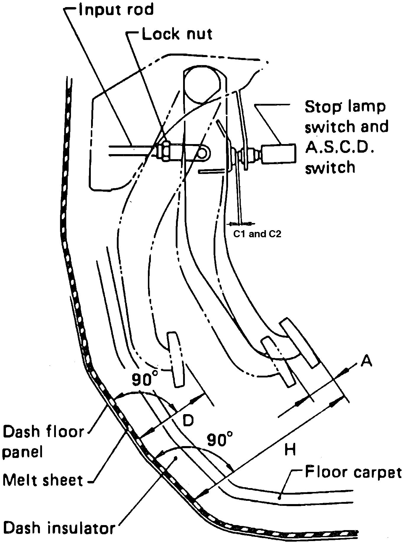 3. Measure clearance dimension ``C'' Fig. 6. Clearance between pedal stopper and threaded end of brake light switch should be .012-0.39 inches. Clearance between pedal stopper and threaded end of A.S.C.D switch if equipped, should be .012-0.39 inches.