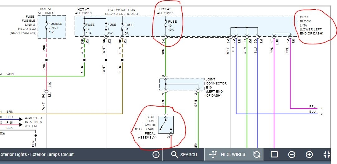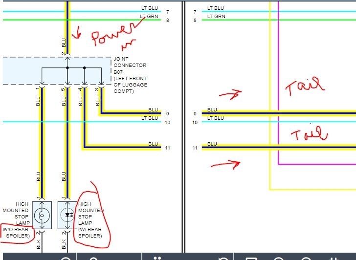 Okay, then we need to start at the beginning. In the fuse panel inside the vehicle, check fuse 10. I attached a pic I need you to look at as well. If the fuse is good, I need you to get under the dash and check if there is constant power to the green wire at the brake light switch. If there is, then actuate the switch (press the brake) and see if power then travels to the red wire. If there is only when the brake is pressed, let me know so we can move on from that point. There is a brake light relay in the relay box under the hood. We will check that next.