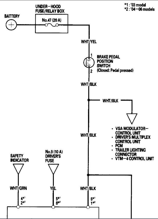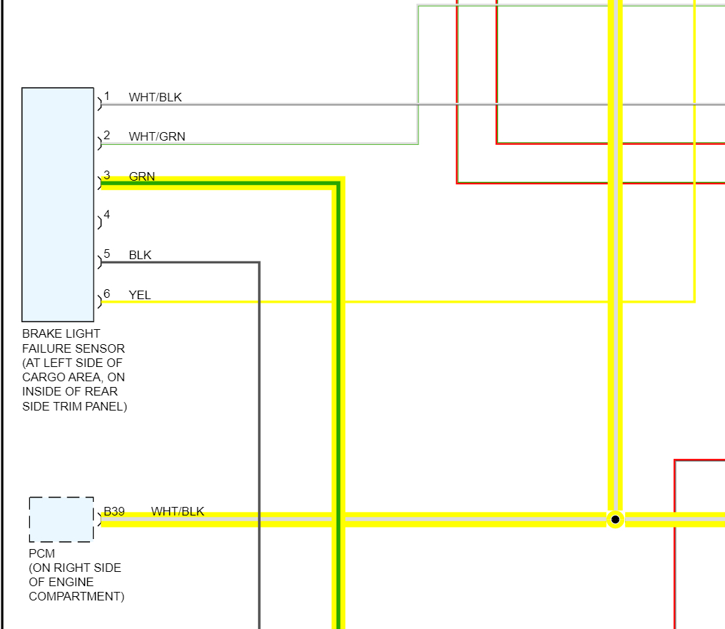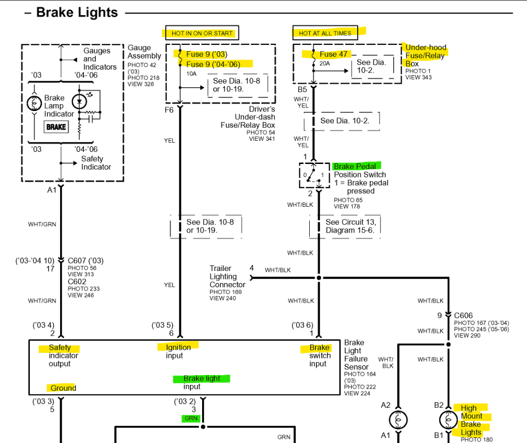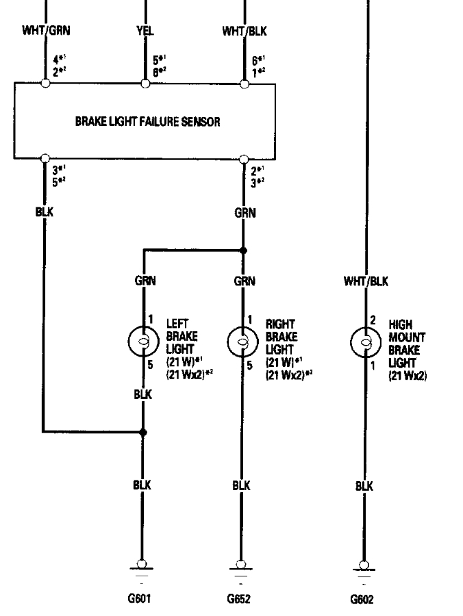 Hello, I can see why this circuit is a bit confusing, I'm going to post the aftermarket wiring diagrams to show what's probably going on here but will check the OEM diagrams to verify these are correct. But to begin with you'll have to locate this Brake light failure sensor, it looks like on pin 3 (green wire) is for the two side brake lamps, and the third (middle) is on a different circuit, why they do this I'm not sure, but I will pull up the rest of the diagrams to explain it all.