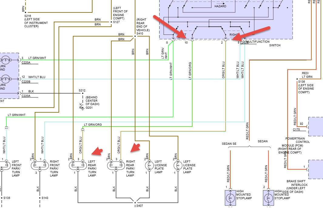 check to see if power is coming from multi function switch in pic then if coming to lights. if goes out switch and not to lights then it's a broken wire if not going into switch which is re/lt grn then it may be a problem there . finally check ground wire connection right rear of trunk.