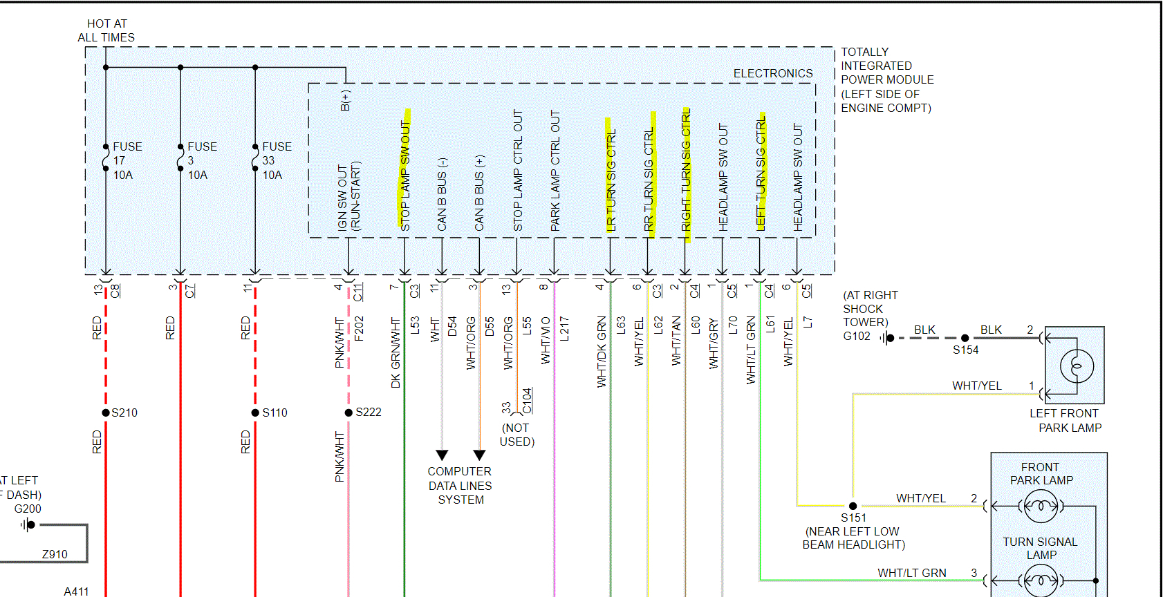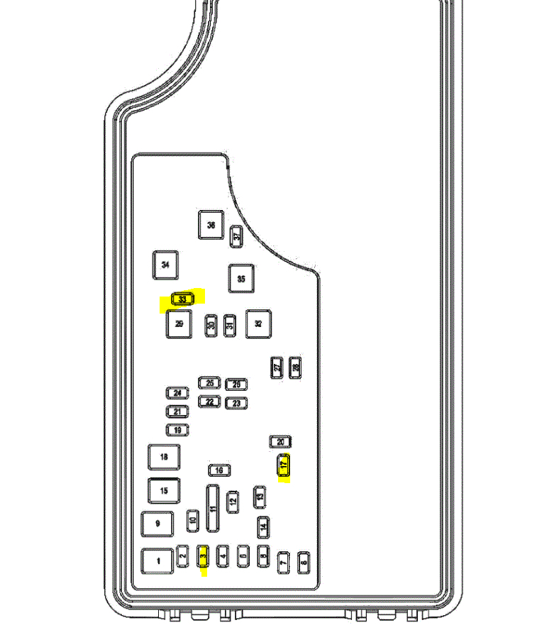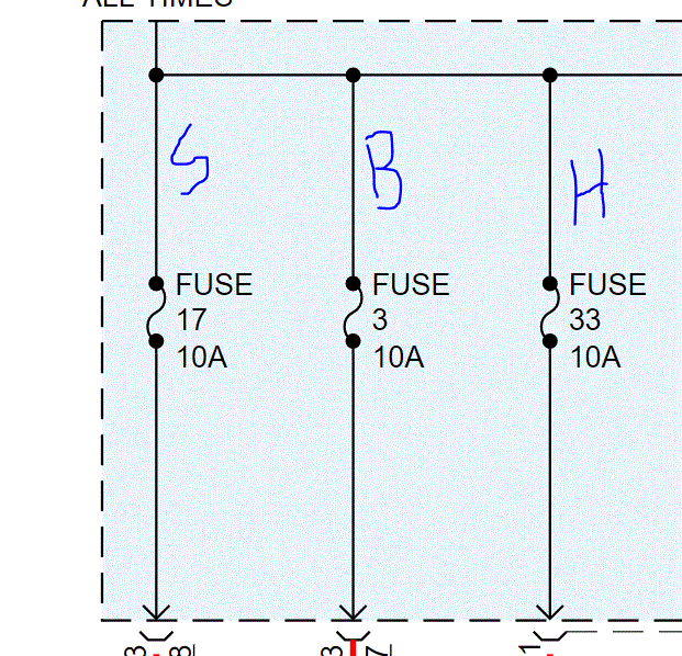 If you look at pic 2, I highlighted wires at the TIPM. You can see that each of them go to the components you are having trouble with. Now, if the brake light switch doesn't have power, I need you to go back to the fuse box and check fuses 3, 17, 33. Not only do we need to check the fuse, but I need you to confirm if there is power in and out of the fuse. You can use a test light to do it. I put a B, S, H next to what each fuse is for, brake, signal, hazard.