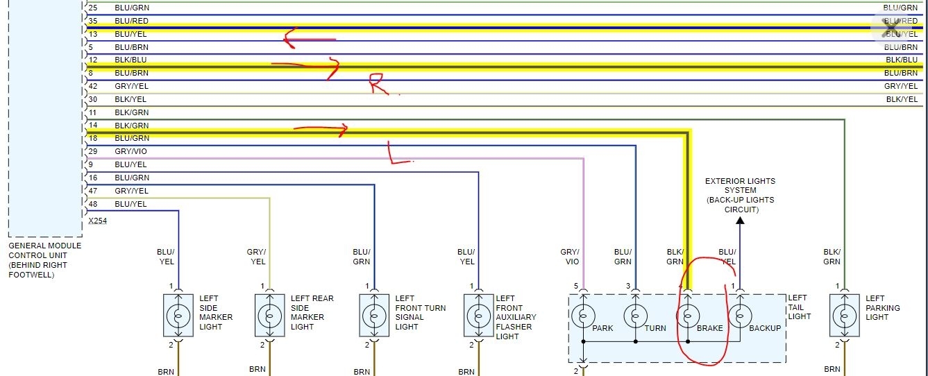 Car had issues with water in the wiring connectors just under the fuse panel. Cut our connectors and soldered all wires back together. I was left with 4 extras that basically were not being used. My brake lights work in the opposite fashion, when you brake they turn off and when you are not hitting the brake they are on. I have replaced the brake switch, bulbs and took the BCM/BCI apart no water ever on that side of the vehicle. All other lights are working, the only other issues I am having are the trunk motor does not pop open. I also do not know if these mins have a button for the trunk to pop open? The brake light is a scary issue that I would like to get fixed. Thank you all for your help this has been a journey.