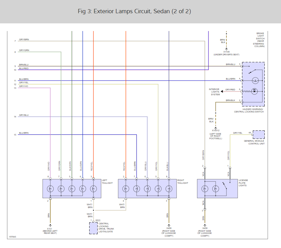 There are four fuses that run the system we should check those first. Here is the brake light wiring diagrams so you can see how the system works if the fuses are good you may need the lighting switching module: