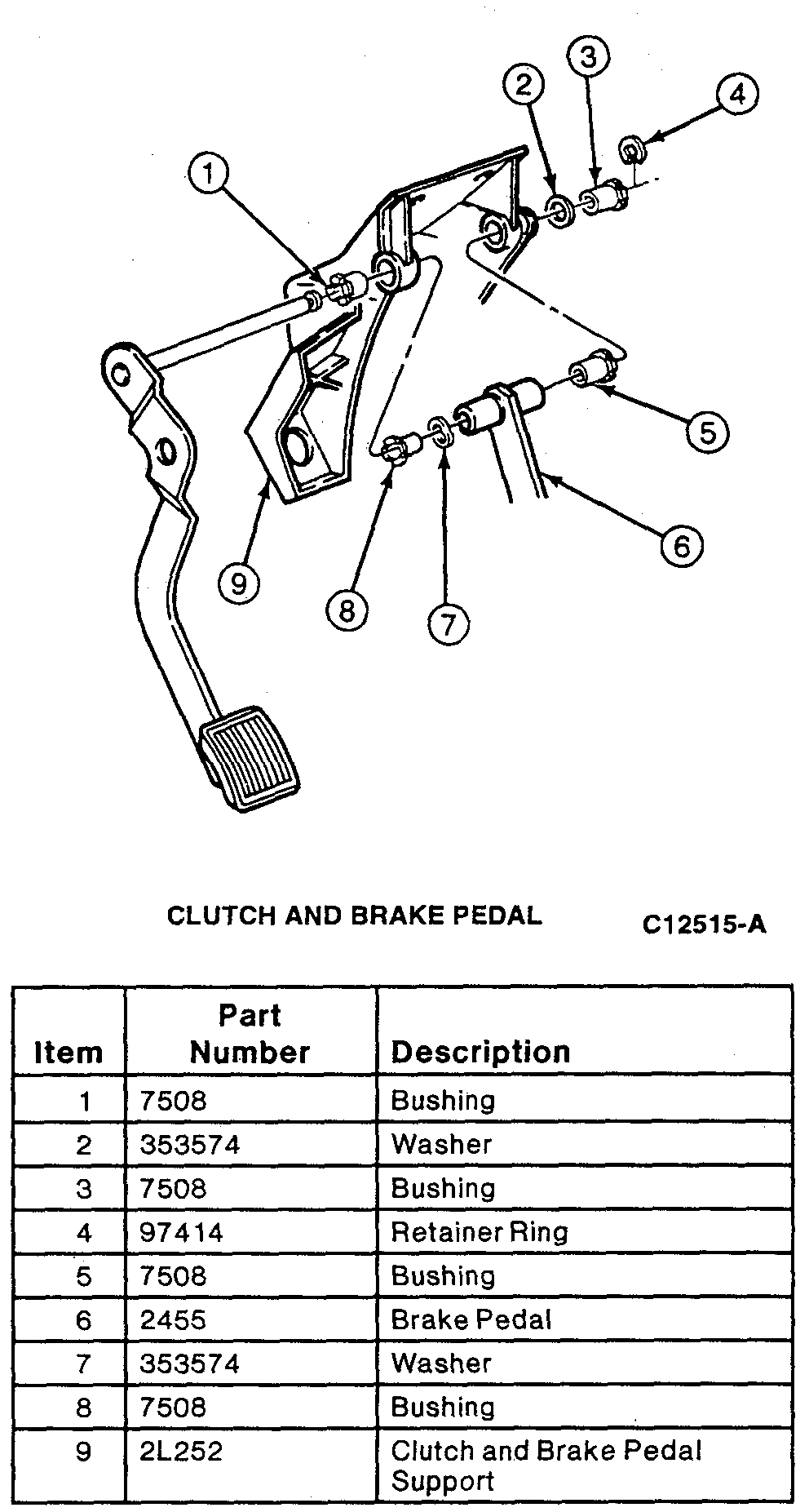 NOTE: When the clutch pedal shaft is removed from the bracket, the brake pedal, brake and clutch pedal bushings and spring washer become accessible.