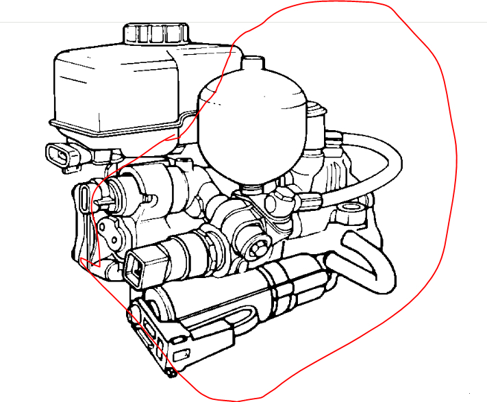 This vehicle may have a Teves brake system. They are unique and not seen too often anymore. So just to confirm, the brake pedal travels to the floor. Is that correct? Also, does your brake master cylinder under the hood have the components mounted to it that I have circled in the picture below?