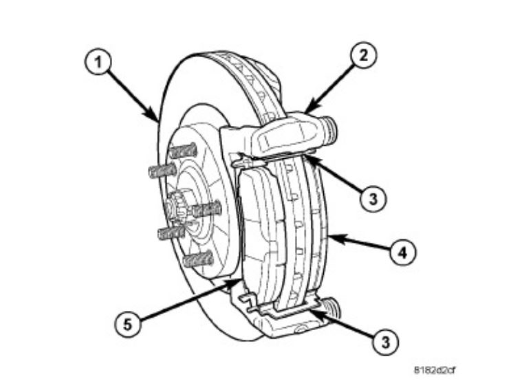 Place the brake pads (4, 5) in the abutment shims (3) clipped into the disc brake caliper adapter bracket (2) as shown. Place the pad with the wear indicator (if equipped) attached on the inboard side (2).