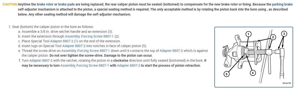 Using the correct tool you squeeze and rotate the piston at the same time and that resets the caliper so the new pads will fit. Be sure that when the piston is fully compressed you rotate it so that the slots in it line up with the pins on the rear of the pad. That keeps the piston from rotating when the park brake is applied.