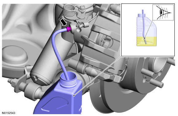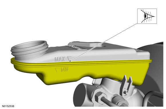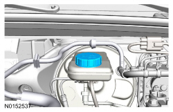 NOTICE: Do not spill brake fluid on painted or plastic surfaces or damage to the surface may occur. If brake fluid is spilled onto a painted or plastic surface, immediately wash the surface with water.