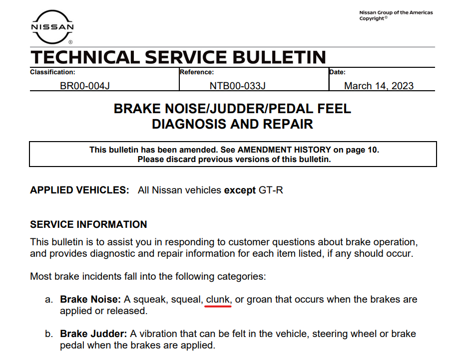 I have a moderately loud clunking noise from underneath (I think) my vehicle when maneuvering at slow speeds in and out of parking spots, etc. My local Nissan dealer says that it is a normal and known sound with Nissan brake design. They said it has to do with the brake pads shifting inside the caliper setup apparently and cannot be adjusted or fixed! I have been told the same by a BrakeMasters dealer and a local independent repair shop. I do not find that an acceptable answer, and I want to know if there is a TSB that addresses this issue, one that my dealership does not seem to know about. My previous model Rogue (2015) did not have this problem, and no other car model I have owned has had this problem. What's the story?