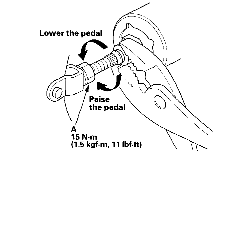 3. Loosen the pushrod locknut (A), and screw the pushrod in or out with pliers until the standard pedal height from the floor is reached. After adjustment, tighten the locknut firmly. Do not adjust the pedal height with the pushrod pressed.