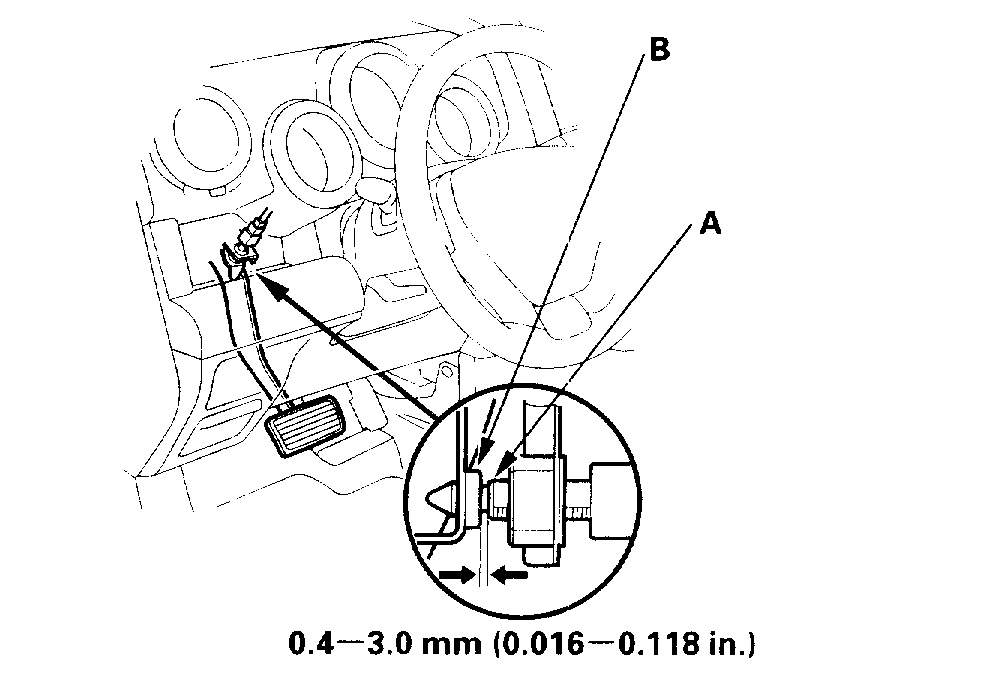 4. Push in the brake pedal position switch until its plunger is fully pressed (threaded end (A) touching the pad (B) on the pedal arm). Then, turn the switch 45° clockwise to lock it. The gap between the brake pedal position switch and the pad is automatically adjusted to 0.4 to 3.0 mm (0.016 - 0.118 inch) by locking the switch. Make sure the brake lights go off when the pedal is released.