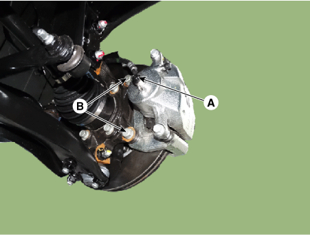 Loosen the Guide rod bolt (B) and then remove the caliper body (A).