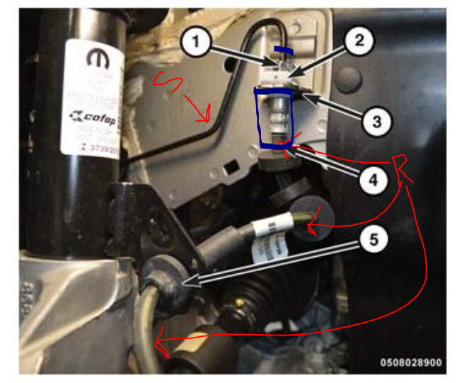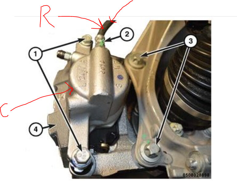 I attached two pics below showing the steel brake line (S), rubber brake hose (R) and the brake caliper. These are located behind the wheel. Check to see if you can determine where the leak is coming from. If it is the rubber hose, we can take care of that somewhat easily. The steel line will require more time and effort.