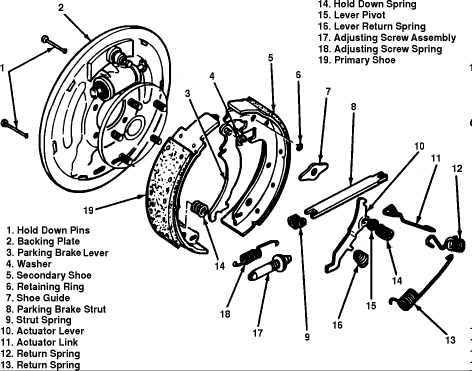 Using brake spring pliers or equivalent, unhook primary and secondary return springs. Observe location of brake parts being removed to aid during installation.
