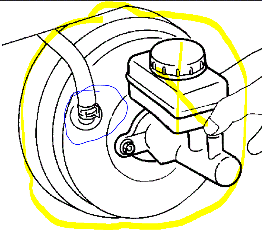 If you look below, I circled the booster with yellow, placed an X over the master cylinder (that isn't the cause), and in blue, I circled the vacuum hose. Make sure the hose is attached and if you trace it, it will take you back to the engine where it will connect to the intake manifold. Make sure nothing on that hose is damaged, cracked, dry rotted, or loose.