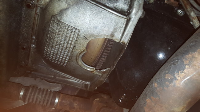 I just put a rebuilt engine in my truck, got it back from the mechanic yesterday, and now this! I have a big piece missing from my bell housing covering the torque converter! I think it should be replaced asap, but I don't have the money right now to do it. Should I drive with the piece missing? I know a lot of these have a drain plug there that is missing, but this is about twice the size of the plug hole I have seen in other pictures.