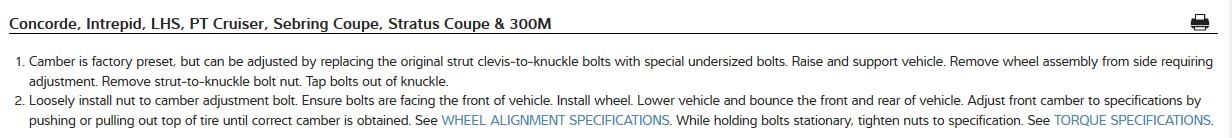 Do all PT Cruisers have camber and caster? because i did the CV axle replacement. And of course i had to take the two top bolts and nuts off of the knuckle from strut. Would that do something to my camber? Reason i am asking is because the two bolts broke initially in half. I went to my local scrap yard. And got two from the same exact year and make of my vehicle and used them. Now from up top looking towards the ground my tire appears to be more inward on the bottom and outward on top.