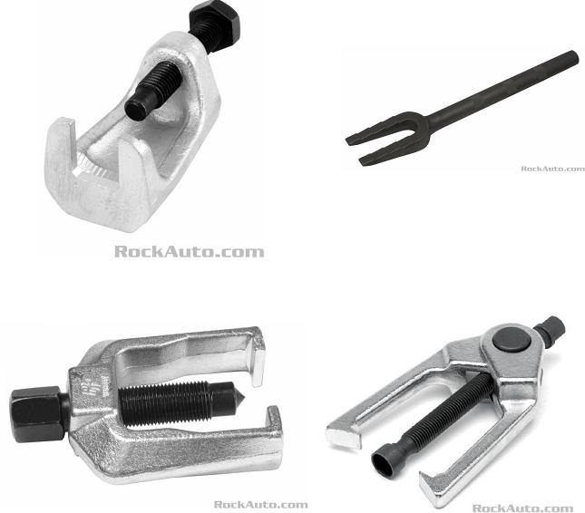 The third photo shows some tools for removing the outer tie rod's tapered stud from the steering arm. An alternative trick is to bang on the side of the arm next to the stud once the nut is removed. The shock is often enough to break the taper.