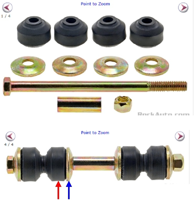 Your model uses the most common anti-sway bar link design. It has been around since forever. See the fourth photo. The top shows the pieces you get in the kit for one link. When these fail, they sound like a tambourine on bumpy roads. Getting the old ones off usually requires an air-powered cutoff tool or an angle grinder. The nuts get rusted tight and commonly round off. The big secret to these is you do not fully tighten the nut when installing them. Rather, run the nut down until the rubbers expand to exactly the same diameter as the steel washers, as shown in the fourth photo, (red and blue arrows), at the bottom. GM used to use shock absorbers with a threaded stud on top, and two rubbers like those shown here. The same applies. When tightening the nut, do so just until the rubbers expand to the same diameter as the metal washers. If those are over-tightened, they'll bind or pinch when that stud needs to tip and swivel a little as the vehicle bounces up and down.