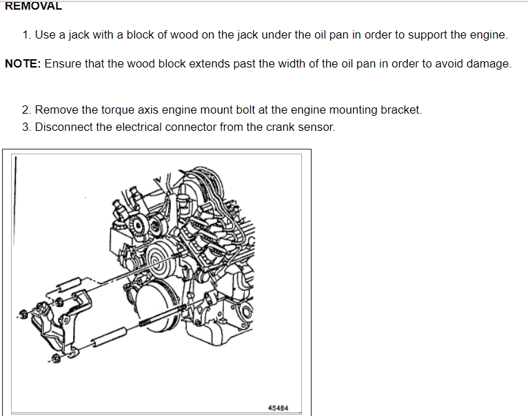 1. Use a jack with a block of wood on the jack under the oil pan in order to support the engine. NOTE: Ensure that the wood block extends past the width of the oil pan in order to avoid damage.