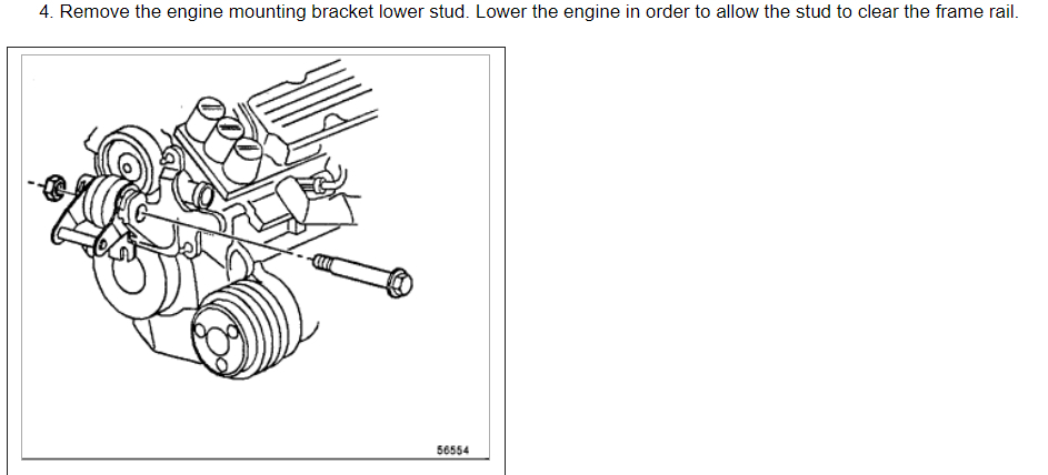 4. Remove the engine mounting bracket lower stud. Lower the engine in order to allow the stud to clear the frame rail.