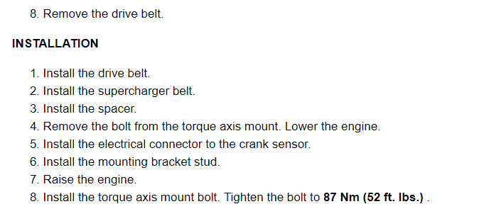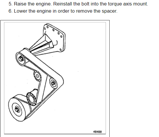 5. Raise the engine. Reinstall the bolt into the torque axis mount.