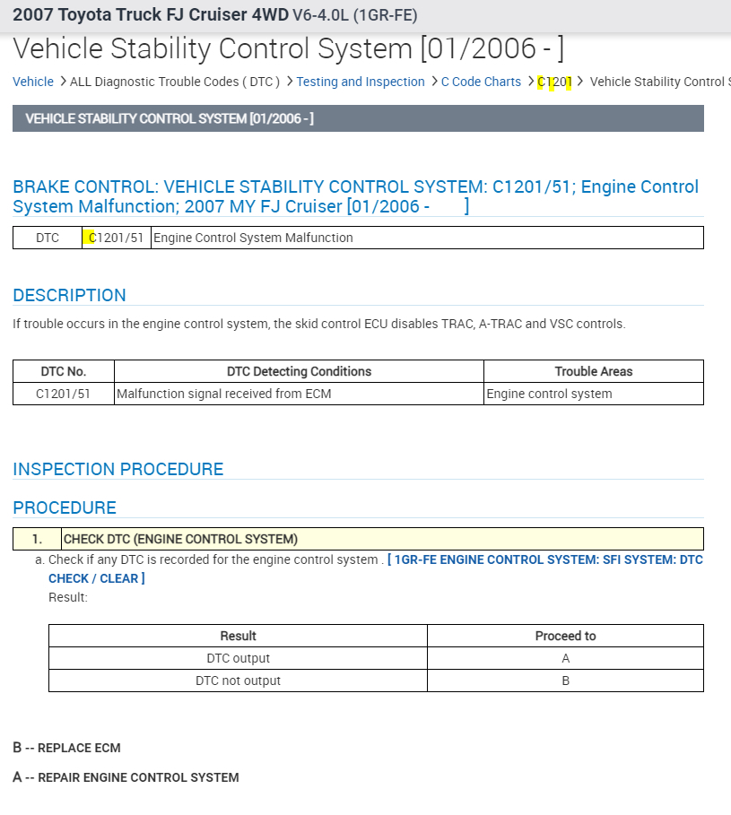The C1201 is the one which signals the vehicle to turn on the check engine light and disable the traction control and VSC.