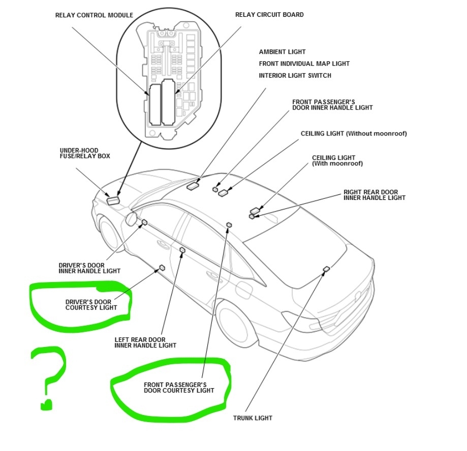 I am looking for a labeled diagram for my car listed above touring cabin fuse box relay diagram. I want to find out which of them feeds to the bowl lights, if any. I would like to tap into the bowl light circuit for a door handle led project.