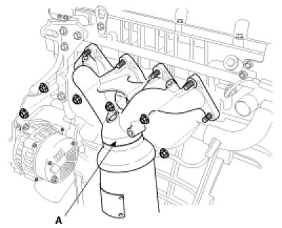 5. Remove the exhaust manifold and catalytic converter assembly(A).