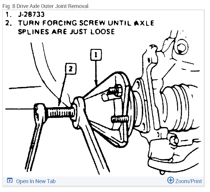 6. Remove drive axle from hub and bearing assembly using front hub spindle remover tool No. J-28733-A, or equivalent, Fig. 8 .