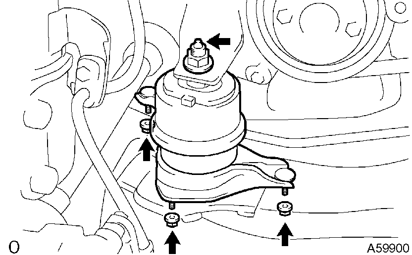 e) Remove the 4 nuts from the engine mounting insulator RH. Raise the engine and remove the engine mounting insulator RH.