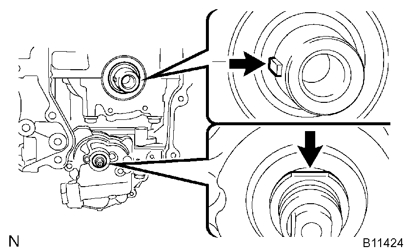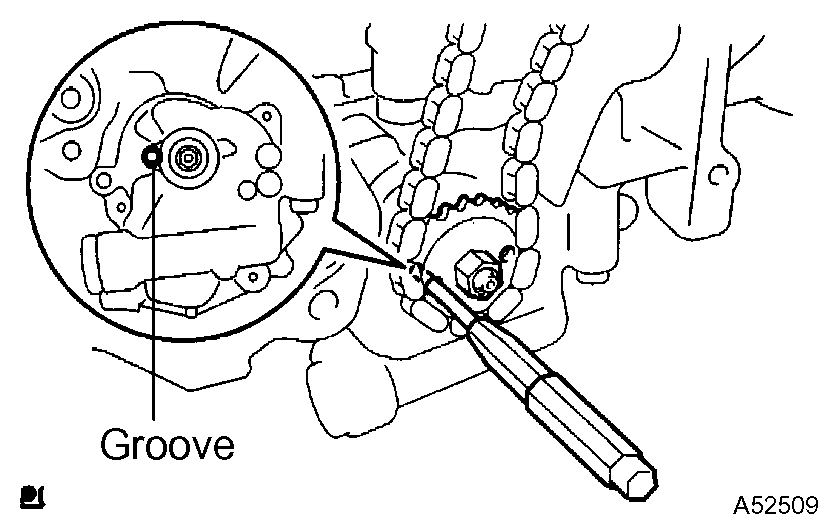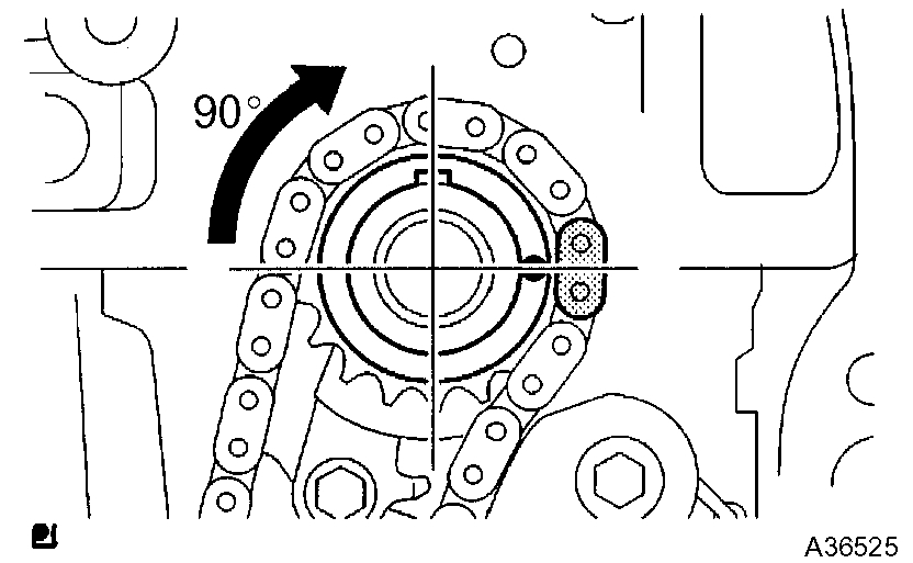 a) Turn the crankshaft counterclockwise by 90°, and align an adjusting hole of the oil pump driven sprocket with the groove of the oil pump.