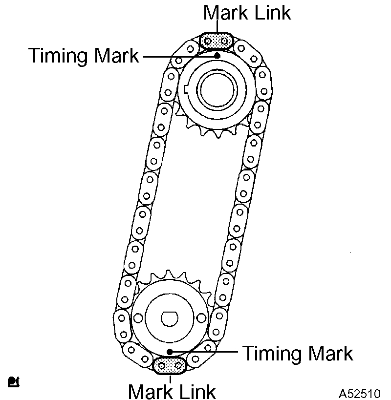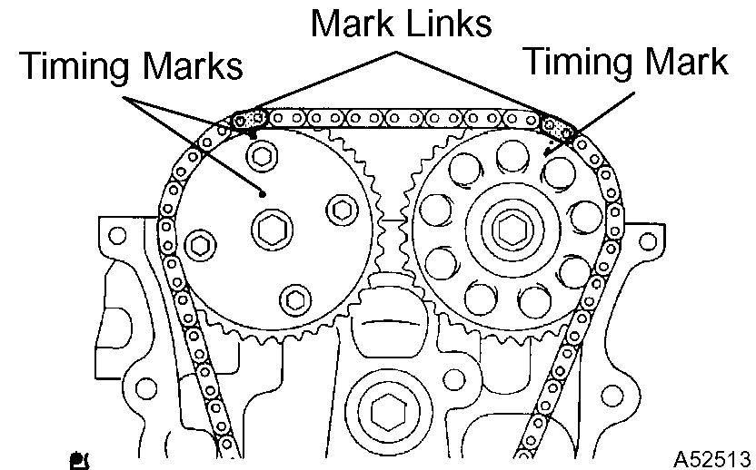 d) Align the mark links (gold or yellow colored links) with the timing marks of the camshaft timing gear and camshaft timing sprocket. Install the chain.