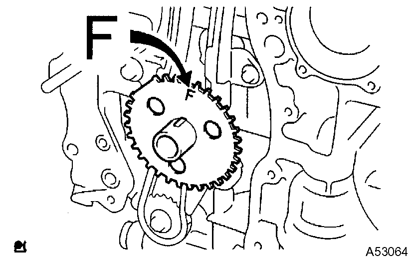 b) Put a bar ([diameter] 4 mm (0.16 inch)) in the adjusting hole of the oil pump driven sprocket to temporarily lock the sprocket in position. Remove the nut.