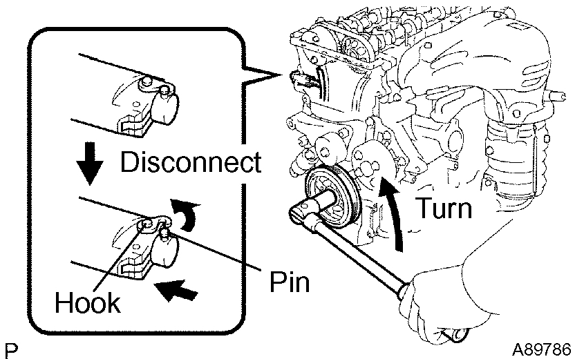 b) Turn the crankshaft counterclockwise and disconnect the plunger knock pin from the hook.
