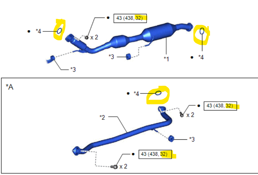 In the 1st diagram, the last number highlighted in yellow is the Torque Spec in Ft Lbs. A regular torque wrench will read in (Ft Lbs), smaller ones read in (in lbs). I have also circled the gaskets for each location.